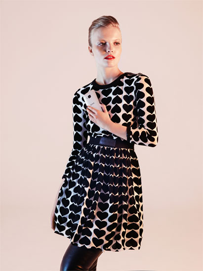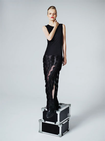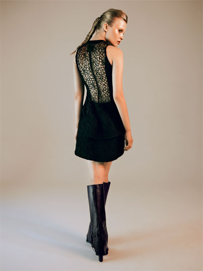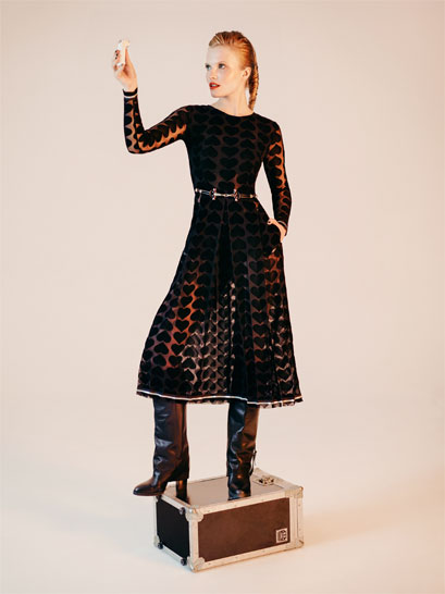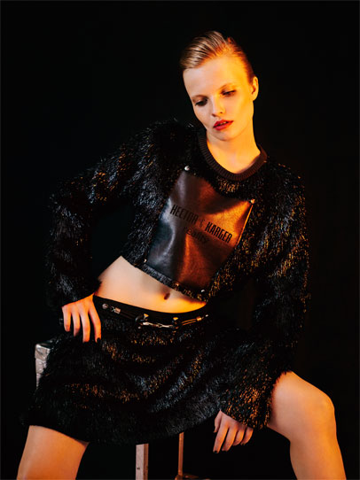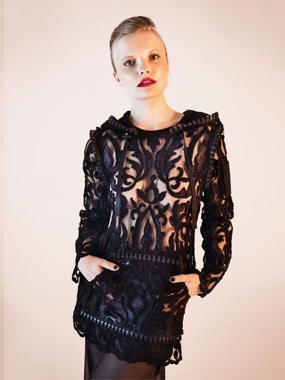 which underline the bust and waist; leather pants with special push-up buttocks appliqué; lace blouses with oversized, chunky zippers or latex prints; lace/sequin sweatpants; transparent blouses and dresses with velvet hearts. The dominating fabrics are structured lace, leather, velvet prints and sequins.