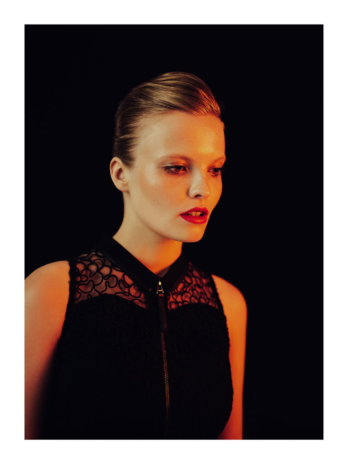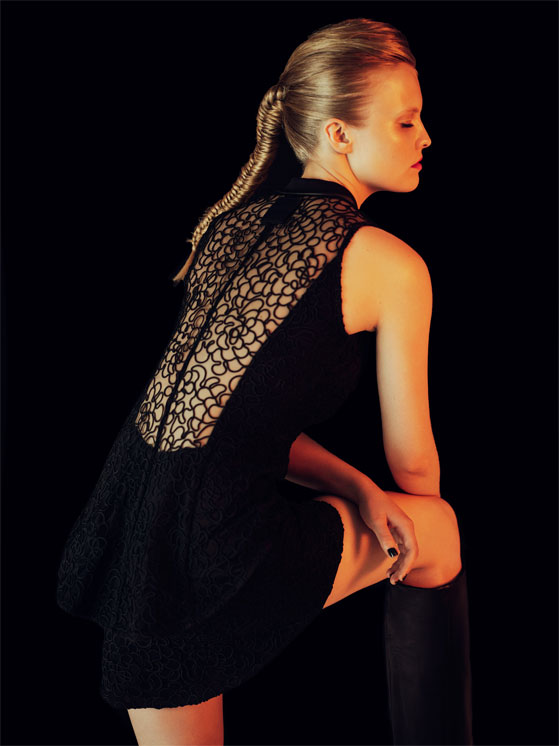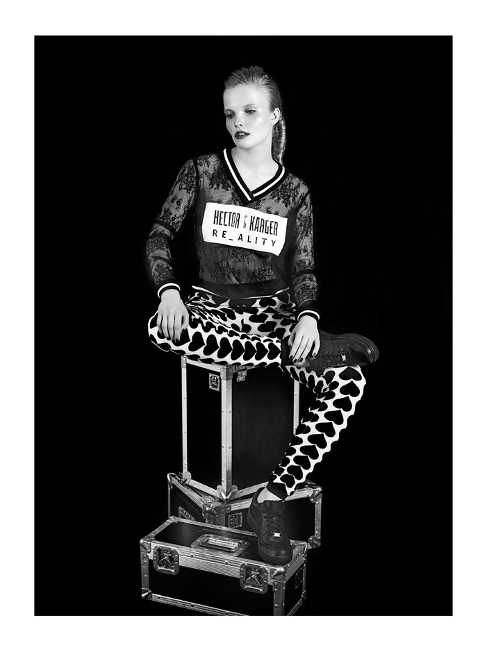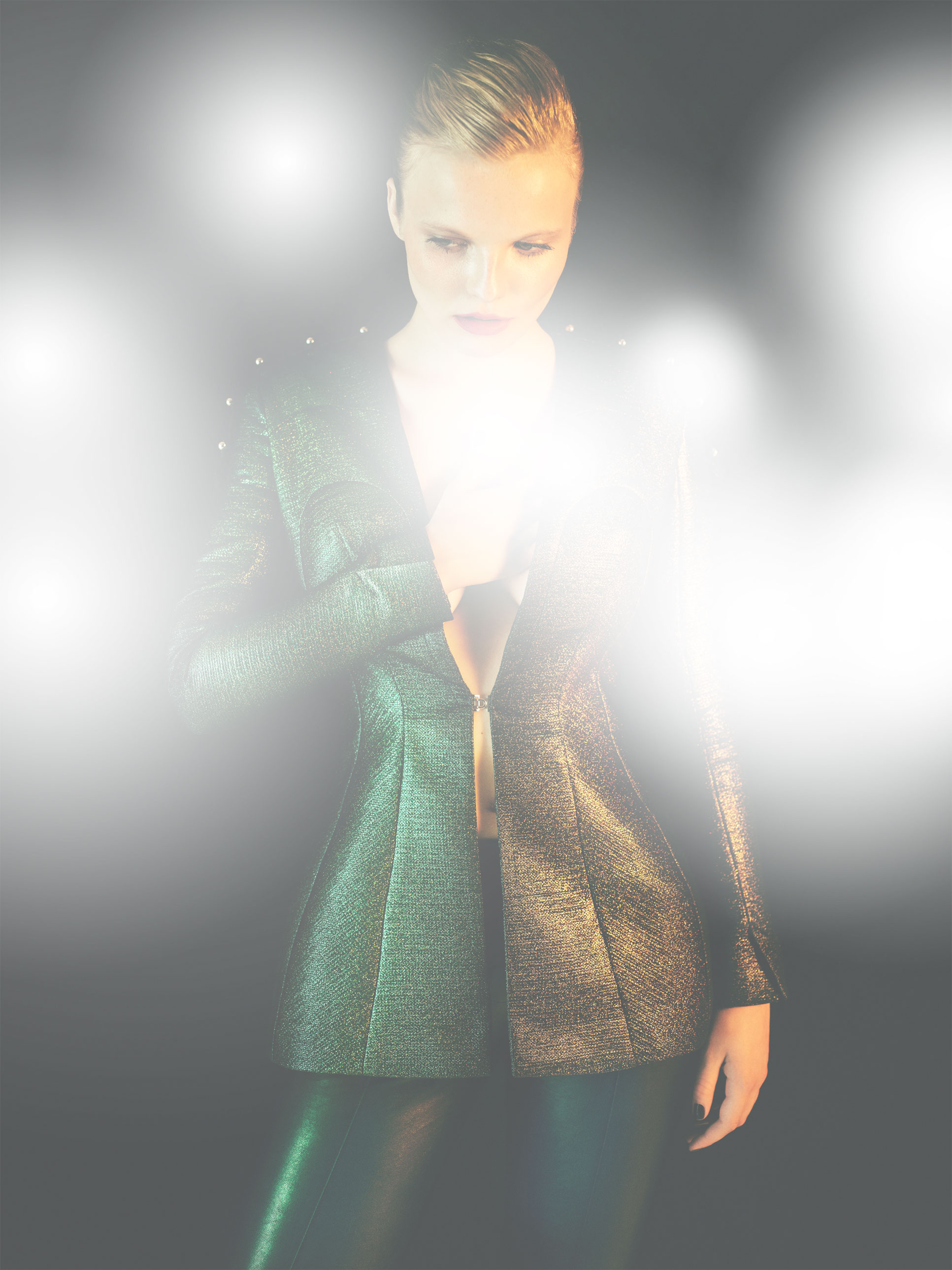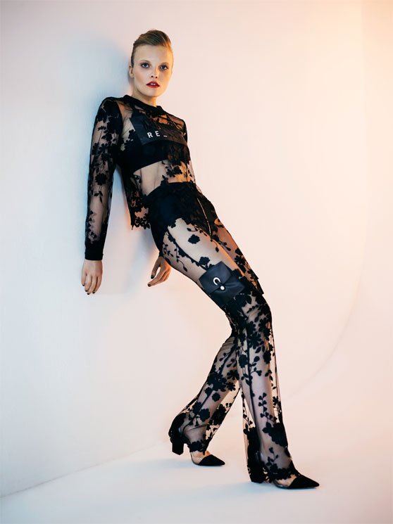 between Helmut Newton’s awe-inspiring pictures from the 80s, sex appeal typical of French magazines, and the newest technologies. The collection is rooted in shades of black, white and dark green. The red dress, beautifully emphasizing feminine figure, stands out from the collection. It was inspired by the classic color of Estēe Lauder’s Pure Color Envy lipstick. Estēe Lauder is actually responsible for creating the make-up looks for the RE_ALITY lookbook.