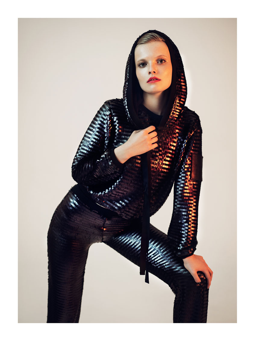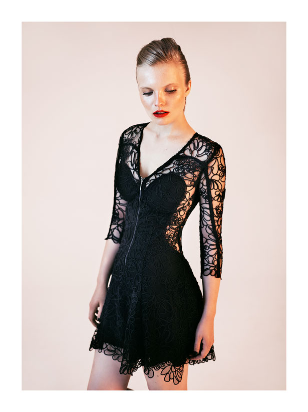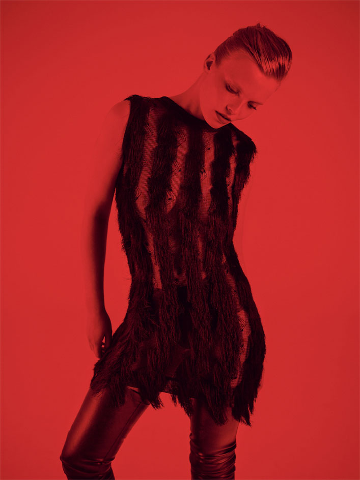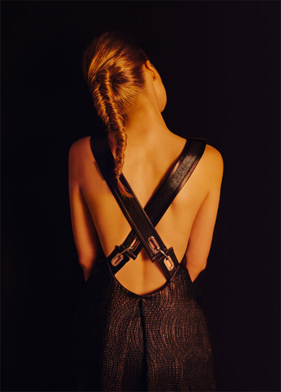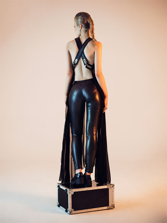 between Helmut Newton’s awe-inspiring pictures from the 80s, sex appeal typical of French magazines, and the newest technologies. The collection is rooted in shades of black, white and dark green. The red dress, beautifully emphasizing feminine figure, stands out from the collection. It was inspired by the classic color of Estēe Lauder’s Pure Color Envy lipstick. Estēe Lauder is actually responsible for creating the make-up looks for the RE_ALITY lookbook.